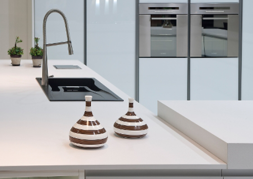 Det er viktig at underlaget (skapskrogene) er nøye avrettet. Platene legges oppå skapskrogene og justeres i forhold til vinkler og hjørne sammenføyninger. Ved eventuelle tykkelse forskjeller / små avvik på høyder, rettes dette opp ved å legge tynne shims av stål mellom skrog og steinplate slik at oversiden på de forskjellige platene ligger likt. Deretter blir alle skjøter maskert og fuget.